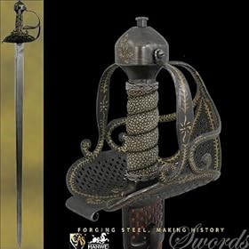 Oliver Cromwell (1599 1658) was a powerful figure in English history during and after the English Civil War, when he rose from the rank of Captain of Horse to Lord Protector of England. His sword, said to have been carried at the battle of Drogheda in 1649, has been remarkably well preserved and features in the collection of the Royal Armouries in Leeds, England, where it is displayed in the permanent collection. Our Cromwell Sword is an accurate replica of the original mortuary hilt style and features a blackened guard decorated in a gold foliage pattern with a wire-wound sharkskin grip. As the original sword now lacks a scabbard , we have provided a design typical of the period. This piece of English history is a must for the ECW collector and re-enactor.