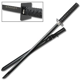 This piece offers a 26 1/2 inch heat tempered carbon steel blade. The handle is imitation ray skin with nylon cord wrapping. Cast metal guard, pommel, and menuki. Includes wood sheath with coordinating nylon cord wrapping. 41 5/8 inches overall.