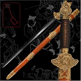 Truly Traditional Chinese Straight Sword (Jian) that is full functional and sharp for serious practitioners of Chinese Swordsmanship & Test Cutting. Each Huanuo sword is individually hand forged of high carbon steel and polished by hand to a mirror finish with a pronounced central ridge. These Jian blades are 30" (76 cm.) long plus or minus 1/2" and each jian on its own, without the scabbard, weights 2 lb. (.9 kg.) plus or minus 3 oz. The solid brass fittings are mounted on a wooden scabbard.