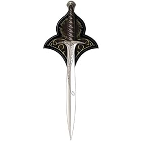 Includes a parchment certificate of authenticity and a wood display plaque. Overall length: 22" Blade Length: 15" Blade Thickness: 1/4" Blade Material: Tempered 420 J2 stainless steel, etched runes in the Elven language. Handle Material: Wood handlegrip adorned with Elven vine design, solid metal guard and pommel, antique metal finish, rat-tail tang construction. Plaque: 9-3/16" x 11-3/8" x 3/4" wood, Silkscreened Elven runes. Hardware, instructions included.