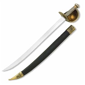 The sword of choice for Pirates, this classic recreation offers a 22" stainless steel blade with heavy blood groove; a pirate ship adorns the cast metal bronze plated cup style guard which surrounds the cast metal hand grip. The custom blade sheath is accented with cast metal throat and tip adorned with skull and cross bone symbols. 29" overall.