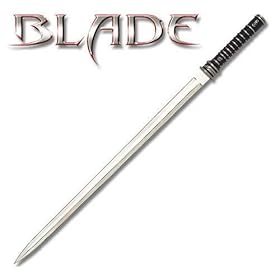 The Daywalker the half man, half immortal vampire, of the hit films Blade, Blade 2 and Blade Trinity wields this licensed sword. 35 1/8" overall, 27 1/8" double edged polished stainless steel blade. Cast metal handle with machined finish authentic glyphs. Includes black wood display stand with logo medallion. The Day walker scabbard (sold separately, not included with this item) is black composite construction with imitation leather covering, metal fittings, and adjustable nylon straps.