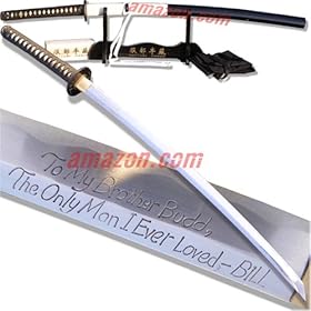 This is a fully functional Kill Bill Budd Sword Replica battle ready katana sword ready for action. This is a very sharpened sword so if you purchase one, please be careful. Comes with a protective cloth bag, a sword cleaning maintenance kit, and a FREE lacquered finish stand with Hattori Hanzo painted on to it. These blades are made of 1045 high carbon steel in the popular Shinogi Zukuri style. The famous quote, ("To My Brother Budd, The Only Man I Ever Loved, -Bill") is ENGRAVED into the blade. The Tsuka (handle) is made with genuine Ray Skin and is wrapped in black cloth braid , which measures 11 long. There is a gold sycamore leaf ornament on the Kashira (buttcap at the end of handle). These buke-zukuri style katana swords have a black metal Tsuba (guard). The Saya's (scabbards) are made of wood with black and white lacquer finish. The Kurikata's (knobs) are wrapped with white cloth cords which are used to suspend the katana sword by your waist. FEATURES Overall length: 41" Blade length: 28 1/5" Tsuka (Handle) Length: 11" Blade material: 1045 High Carbon Steel Full Tang To My Brother Budd, The Only Man I Ever Loved, Bill etched into the blade Solid steel tsuba High quality lacquered wooden scabbard Cloth wrapped handle **Sword Cleaning Kit may vary from picture, but will always include everything you need.