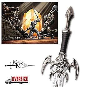 Agnemmel who was a fierce war captain of the Dark One carried Exotath, The Sword of the Dark Elf. Forged by Firaneth, the blade allowed Agnemmel to see into the future, giving him great advantage in battle. Exotath features a 420J2 stainless steel blade (false edged), leather wrapped blade grip, finely detailed cast metal hilt parts with "antique" finish, and a genuine leather wrapped handle grip. Each of the 1500 piece first production run are serial numbered, includes a certificate of authenticity, and an art print hand signed by Kit Rae. 28 3/4" blade, 44 3/4" overall.