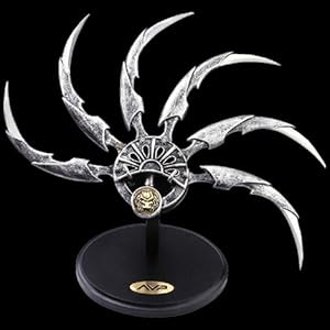 Talk about an item which is screaming for attention. This is the AVP Shuriken. The AVP Shuriken has been given a blade around the border. The blade is sharp and is hold down by six claws which then circulate the arm holder. The blade is also stainless steel. In the movie only the Scar Predator uses this weapon in the film. This movie masterpiece comes with a blade wooden stand which also has the initial AVP in gold.