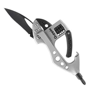 Guppie made by Columbia River Knife and Tool is a multitool designed with a half-inch crescent wrench, 2-inch steel blade, standard and Phillips screw driver, removable bit carrier with LED light, carabineer that duals as a bottle opener and stainless steel clip. Named Blade 2007 Best Buy of the Year
