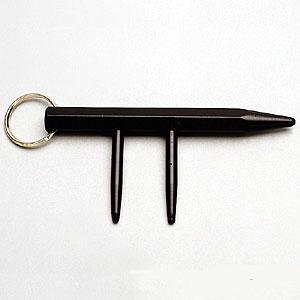 It s a keychain and a self-defense weapon when held so the spokes stick out from between the fingers when making a fist. This keychain packs a mean punch. Made of black metal. 5 1/2 long.